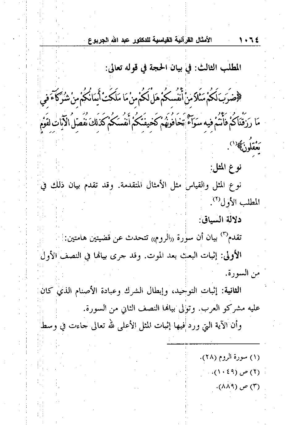المطلب الثالث: في بيان الحجة في قوله تعالى: {ضَرَبَ لَكُمْ مَثَلاً مِنْ أَنْفُسِكُمْ هَلْ لَكُمْ مِنْ مَا مَلَكَتْ أَيْمَانُكُمْ مِنْ شُرَكَآءَ فِي مَا رَزَقْنَاكُمْ فَأَنْتُمْ فِيهِ سَوَآءٌ تَخَافُونَهُمْ كَخِيفَتِكُمْ أَنفُسَكُمْ كَذَلِكَ نُفَصِّلُ الآيَاتِ لِقَوْمٍ يَعْقِلُونَ} 1.