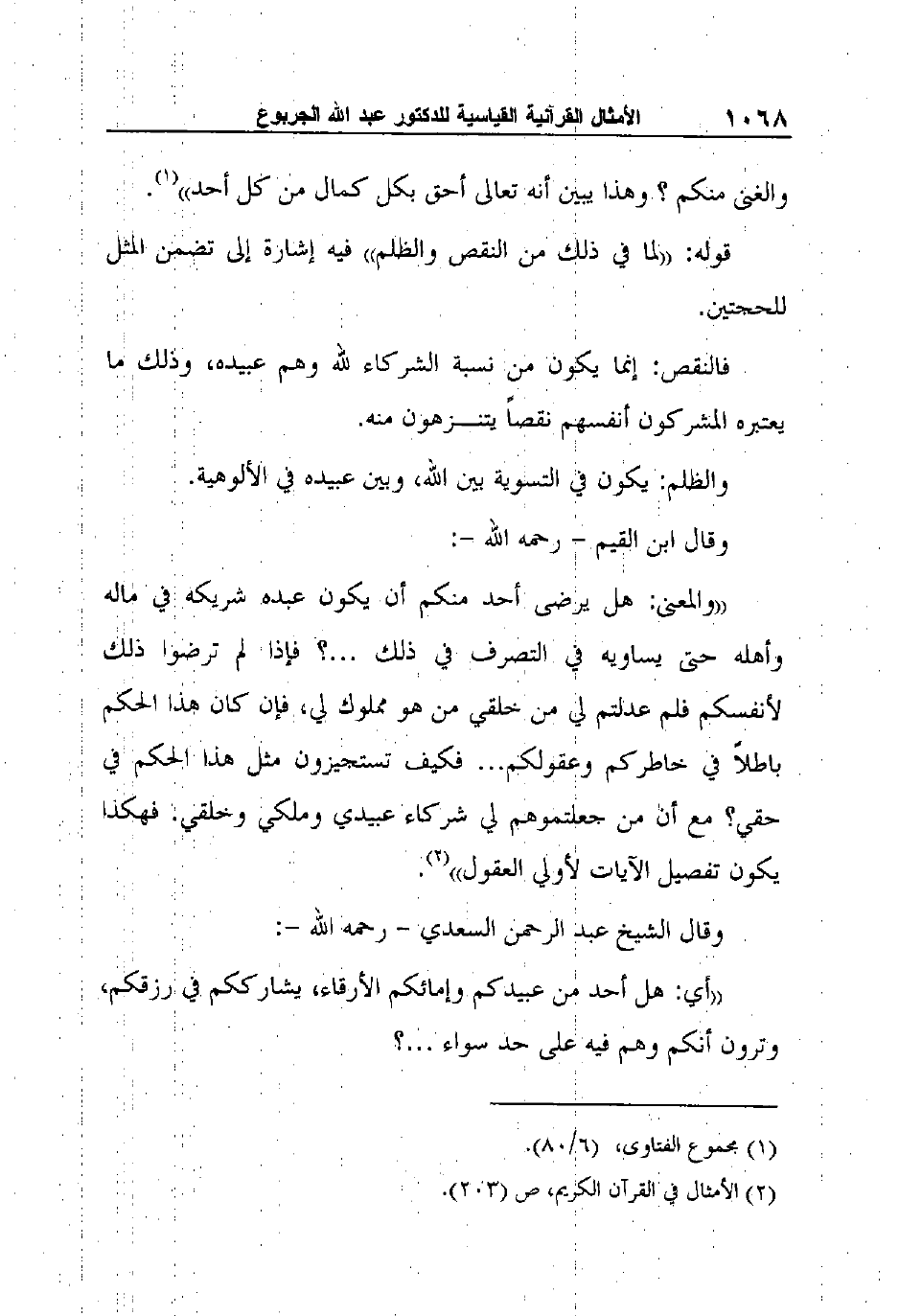 وقال ابن القيم - رحمه الله -: "والمعنى: هل يرضى أحد منكم أن يكون عبده شريكه في ماله وأهله حتى يساويه في التصرف في ذلك ... ؟ فإذا لم ترضوا ذلك لأنفسكم فلم عدلتم لي من خلقي من هو مملوك لي، فإن كان هذا الحكم باطلاً في خاطركم وعقولكم ... فكيف تستجيزون مثل هذا الحكم في حقي؟ مع أن من جعلتموهم لي شركاء عبيدي وملكي وخلقي. فهكذا يكون تفصيل الآيات لأولي العقول"2.