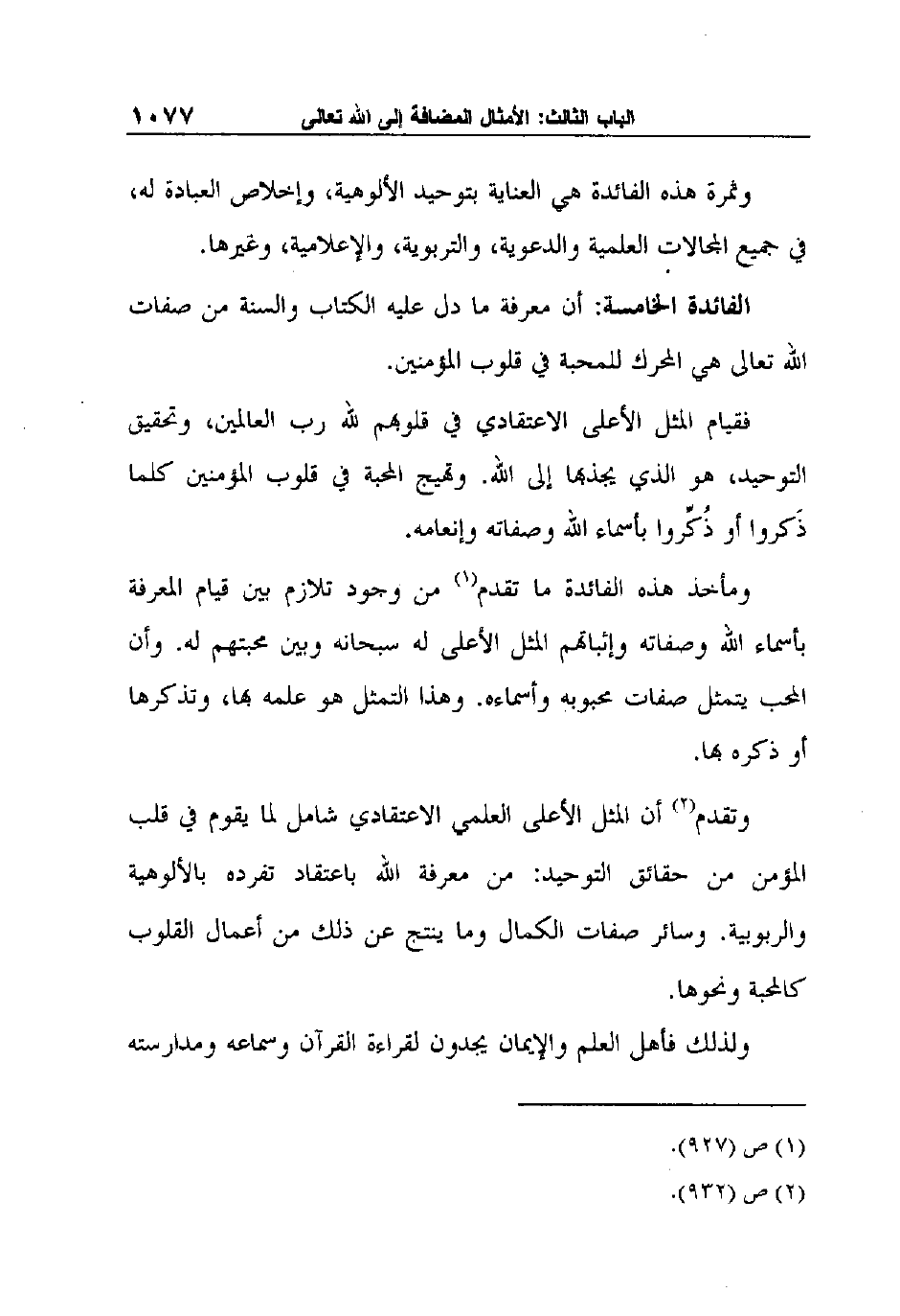 وتقدم2 أن المثل الأعلى العلمي الاعتقادي شامل لما يقوم في قلب المؤمن من حقائق التوحيد: من معرفة الله باعتقاد تفرده بالألوهية والربوبية. وسائر صفات الكمال وما ينتج عن ذلك من أعمال القلوب كالمحبة ونحوها.