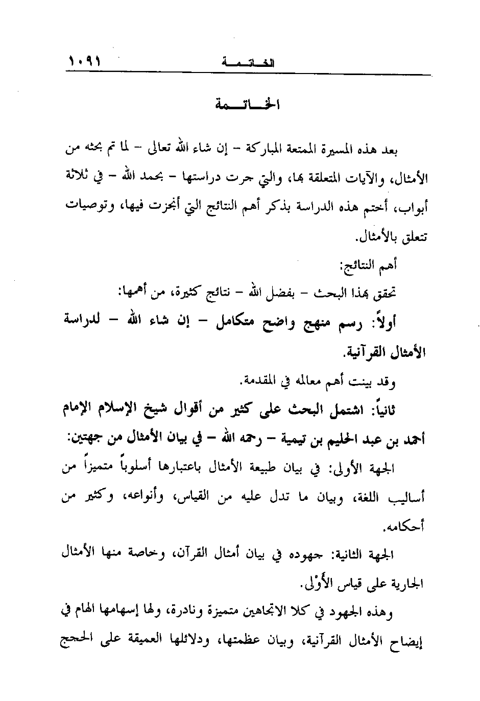 ثانياً: اشتمل البحث على كثير من أقوال شيخ الإسلام الإمام أحمد بن عبد الحليم بن تيمية - رحمه الله - في بيان الأمثال من جهتين: