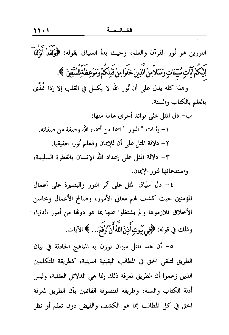 وهذا كله يدل على أن نُور الله لا يكمل في القلب إلا إذا غُذِّي بالعلم بالكتاب والسنة.