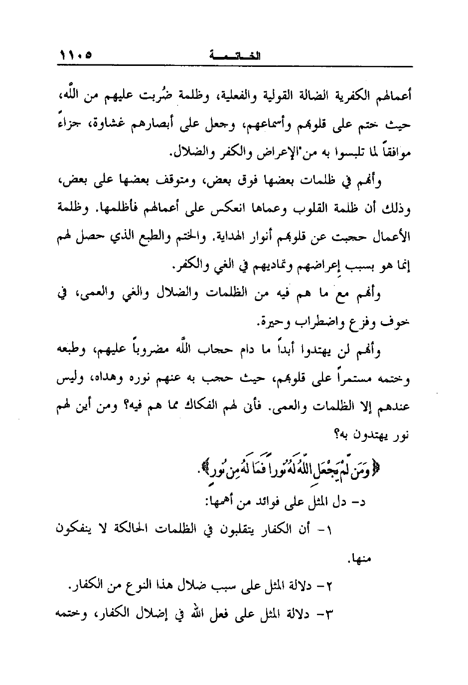 وأنهم في ظلمات بعضها فوق بعض، ومتوقف بعضها على بعض، وذلك أن ظلمة القلوب وعماها انعكس على أعمالهم فأظلمها. وظلمة الأعمال حجبت عن قلوبهم أنوار الهداية. والختم والطبع الذي حصل لهم إنما هو بسبب إِعراضهم وتماديهم في الغي والكفر.