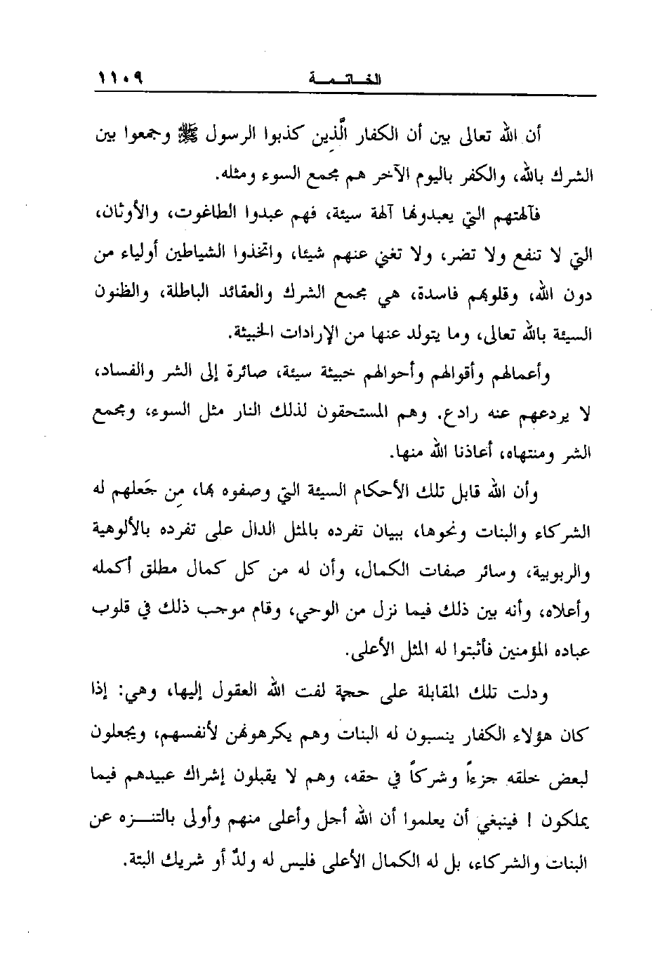 ودلت تلك المقابلة على حجة لفت الله العقول إليها، وهي: إذا كان هؤلاء الكفار ينسبون له البنات وهم يكرهونهن لأنفسهم، ويجعلون لبعض خلقه جزءاً وشركاً في حقه، وهم لا يقبلون إشراك عبيدهم فيما يملكون! فينبغي أن يعلموا أن الله أجل وأعلى منهم وأولى بالتنزه عن البنات والشركاء، بل له الكمال الأعلى فليس له ولدٌ أو شريك البتة.