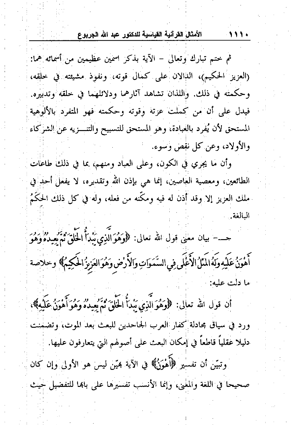 جـ- بيان معنى قول الله تعالى: {وَهُوَ الَّذِي يَبْدَأُ الخَلْقَ ثُمَّ يُعِيدُهُ وَهُوَ أَهْوَنُ عَلَيْهِ وَلَهُ المَثَلُ الأَعْلَى فِي السَّمَوَاتِ وَالأَرْضِ وَهُوَ العَزِيزُ الحَكِيمُ} وخلاصة ما دلت عليه: