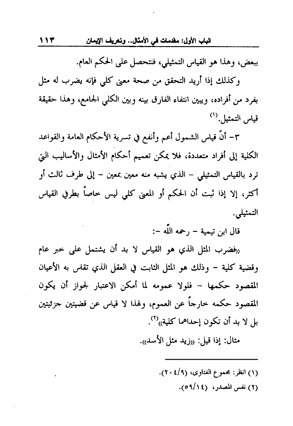 وكذلك إذا أريد التحقق من صحة معنى كلي فإنه يضرب له مثل بفرد من أفراده، ويبين انتفاء الفارق بينه وبين الكلي الجامع، وهذا حقيقة قياس التمثيل.1