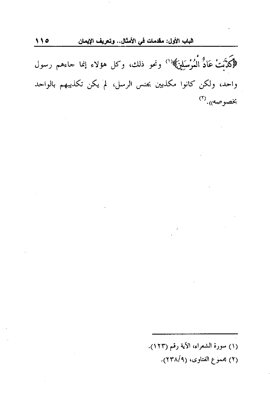 {كَذَّبَتْ عَادٌ الْمُرْسَلِينَ} 1 ونحو ذلك، وكل هؤلاء إنما جاءهم رسول واحد، ولكن كانوا مكذبين بجنس الرسل، لم يكن تكذيبهم بالواحد بخصوصه".2