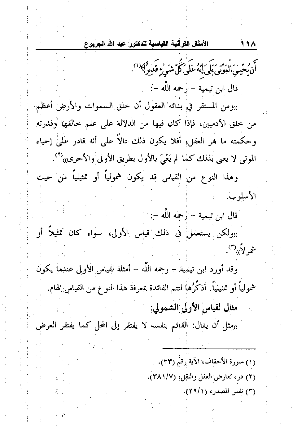 وقد أورد ابن تيمية - رحمه اللَّه - أمثلة لقياس الأولى عندما يكون شمولياً أو تمثيلياً. أذكُرُها لتتم الفائدة بمعرفة هذا النوع من القياس الهام.