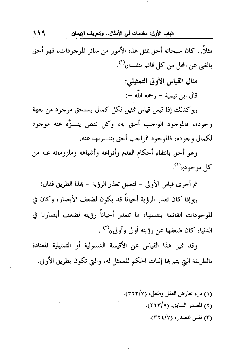 "وكذلك إذا قيس قياس تمثيل فكل كمال يستحق موجود من جهة وجوده، فالموجود الواجب أحق به، وكل نقص ينزَّه عنه موجود لكمال وجوده، فالموجود الواجب أحق بتنزيهه عنه.