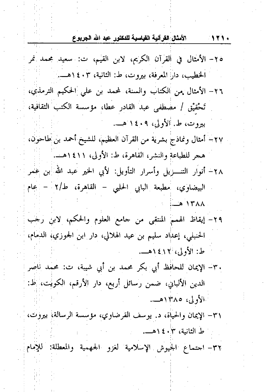 25- الأمثال في القرآن الكريم، لابن القيم، ت: سعيد محمد نمر الخطيب، دار المعرفة، بيروت، ط: الثانية، 1403هـ.