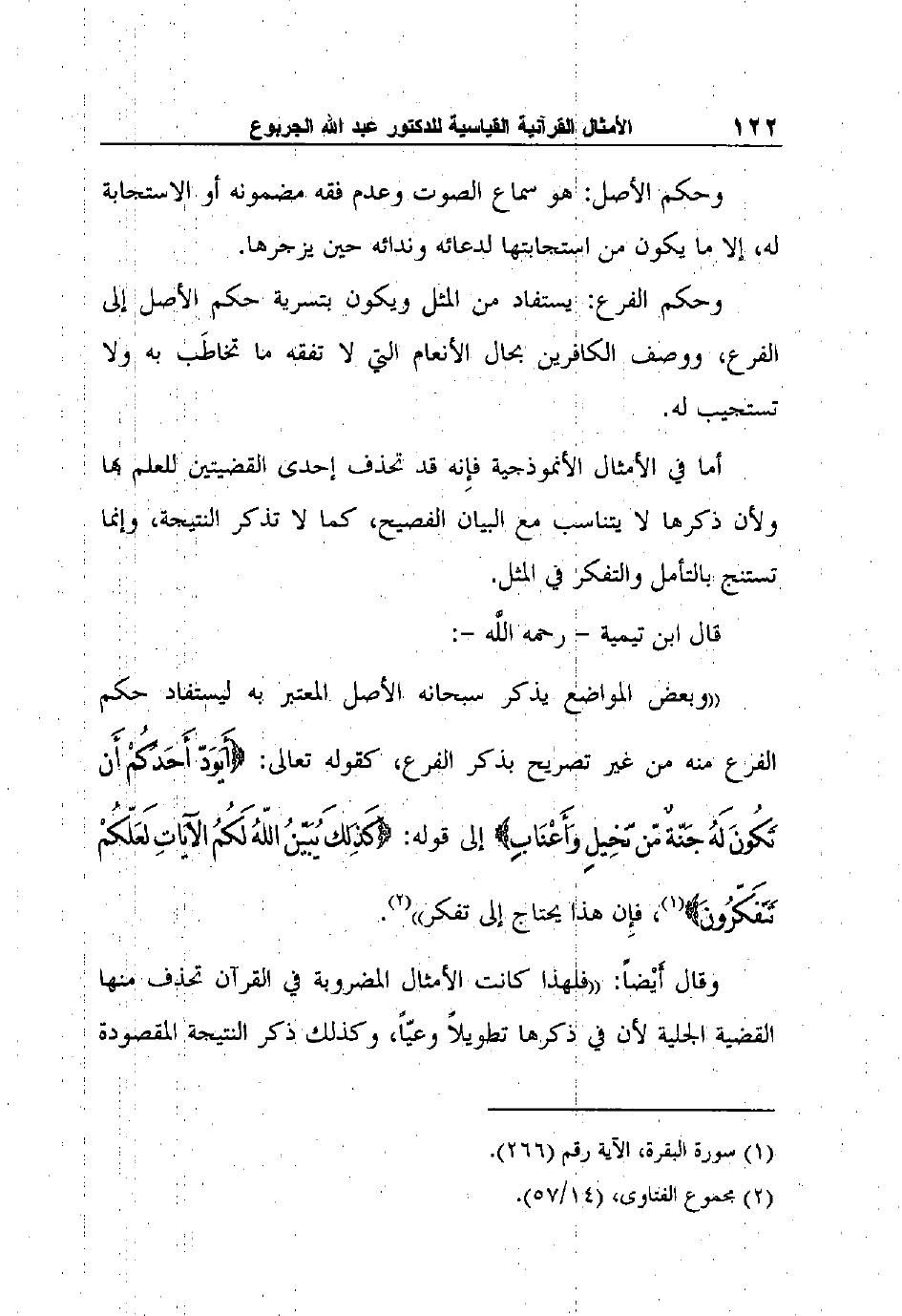 "وبعض المواضع يذكر سبحانه الأصل المعتبر به ليستفاد حكم الفرع منه من غير تصريح بذكر الفرع، كقوله تعالى: {أَيَوَدّ أَحَدُكُمْ أَن تَكُونَ لَهُ جَنّةٌ مّن نّخِيلٍ وَأَعْنَابٍ} إلى قوله: {كَذَلِكَ يُبَيّنُ اللهُ لَكُمُ الآيَاتِ لَعَلّكُمْ تَتَفَكّرُونَ} 1، فإِن هذا يحتاج إلى تفكر"2.
