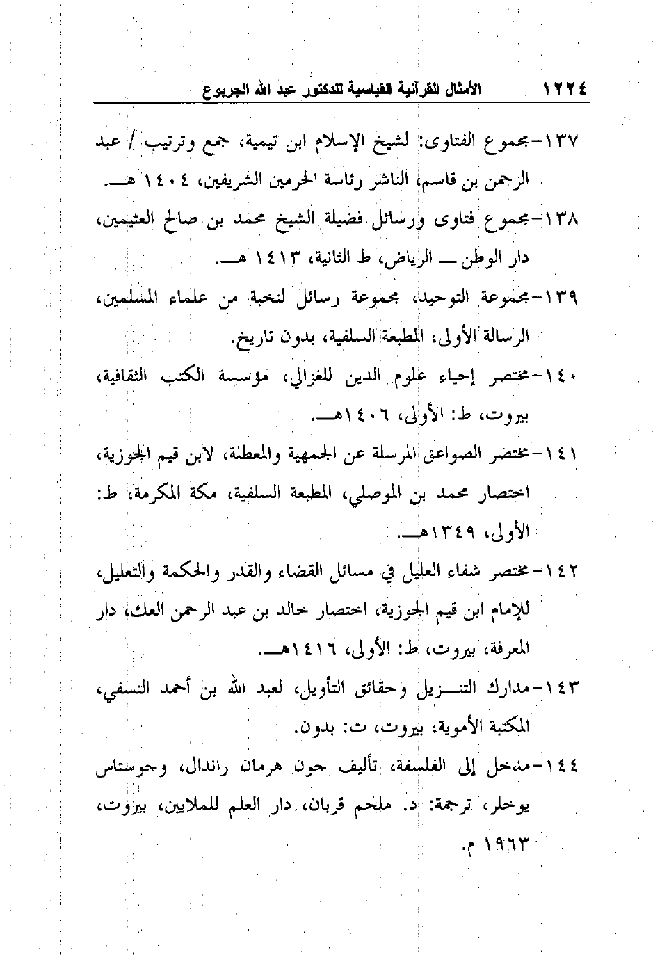 142- مختصر شفاء العليل في مسائل القضاء والقدر والحكمة والتعليل، للإمام ابن قيم الجوزية، اختصار خالد بن عبد الرحمن العك، دار المعرفة، بيروت، ط: الأولى، 1416هـ.