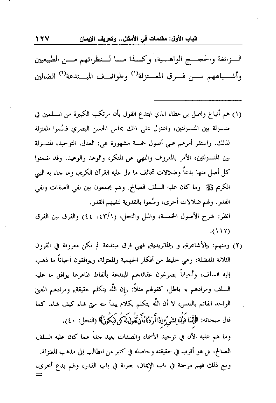 1 هم أتباع واصل بن عطاء الذي ابتدع القول بأن مرتكب الكبيرة من المسلمين في منزلة بين المنزلتين، واعتزل على ذلك مجلس الحسن البصري فسُموا المعتزلة لذلك. واستقر أمرهم على أصول خمسة مشهورة هي: العدل، التوحيد، المنزلة بين المنزلتين، الأمر بالمعروف والنهي عن المنكر، والوعد والوعيد. وقد ضمنوا كل أصل منها بدعاً وضلالات تخالف ما دل عليه القرآن الكريم، وما جاء به النبي الكريم صلى الله عليه وسلم وما كان عليه السلف الصالح. وهم يجمعون بين نفي الصفات ونفي القدر. ولهم ضلالات أخرى، وسُموا بالقدرية لنفيهم القدر.