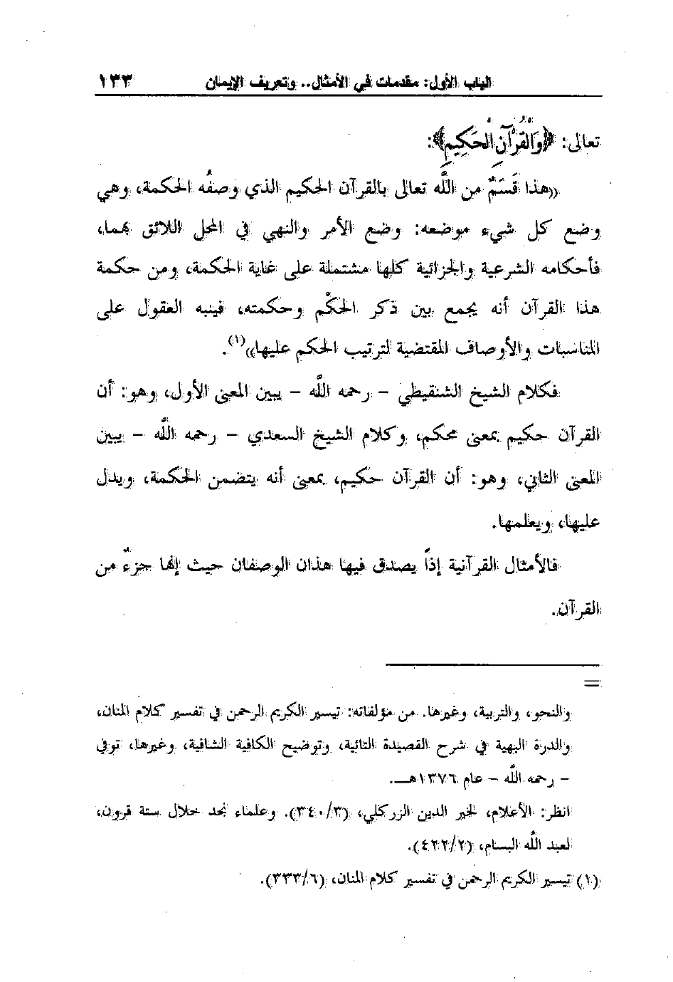 فكلام الشيخ الشنقيطي - رحمه اللَّه - يبين المعنى الأول، وهو: أن القرآن حكيم بمعنى محكم، وكلام الشيخ السعدي - رحمه اللَّه - يبين المعنى الثاني، وهو: أن القرآن حكيم، بمعنى أنه يتضمن الحكمة، ويدل عليها، ويعلمها.