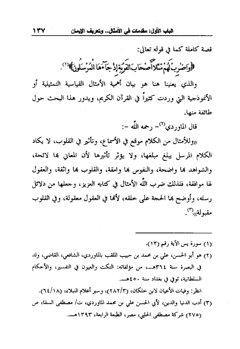 2 هو أبو الحسن، علي بن محمد بن حبيب الملقب بالماوردي، الشافعي، القاضي، ولد في البصرة سنة 364هـ، من مؤلفاته: النكت والعيون في التفسير، والأحكام السلطانية، توفي في بغداد سنة 450هـ.