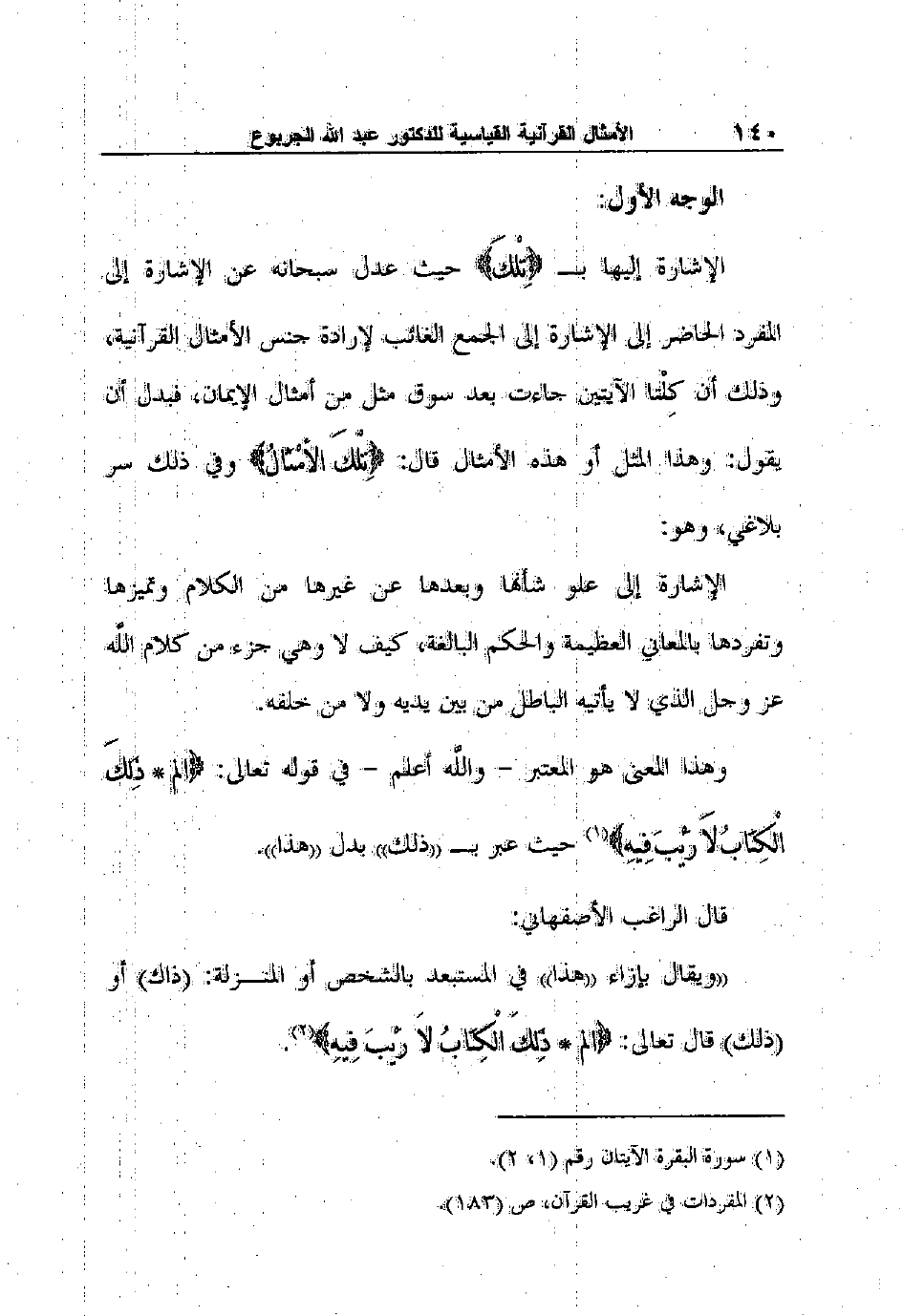 وهذا المعنى هو المعتبر - واللَّه أعلم - في قوله تعالى: {الم ذَلِكَ الْكِتَابُ لاَ رَيْبَ فِيهِ} 1 حيث عبر بـ "ذلك" بدل "هذا".