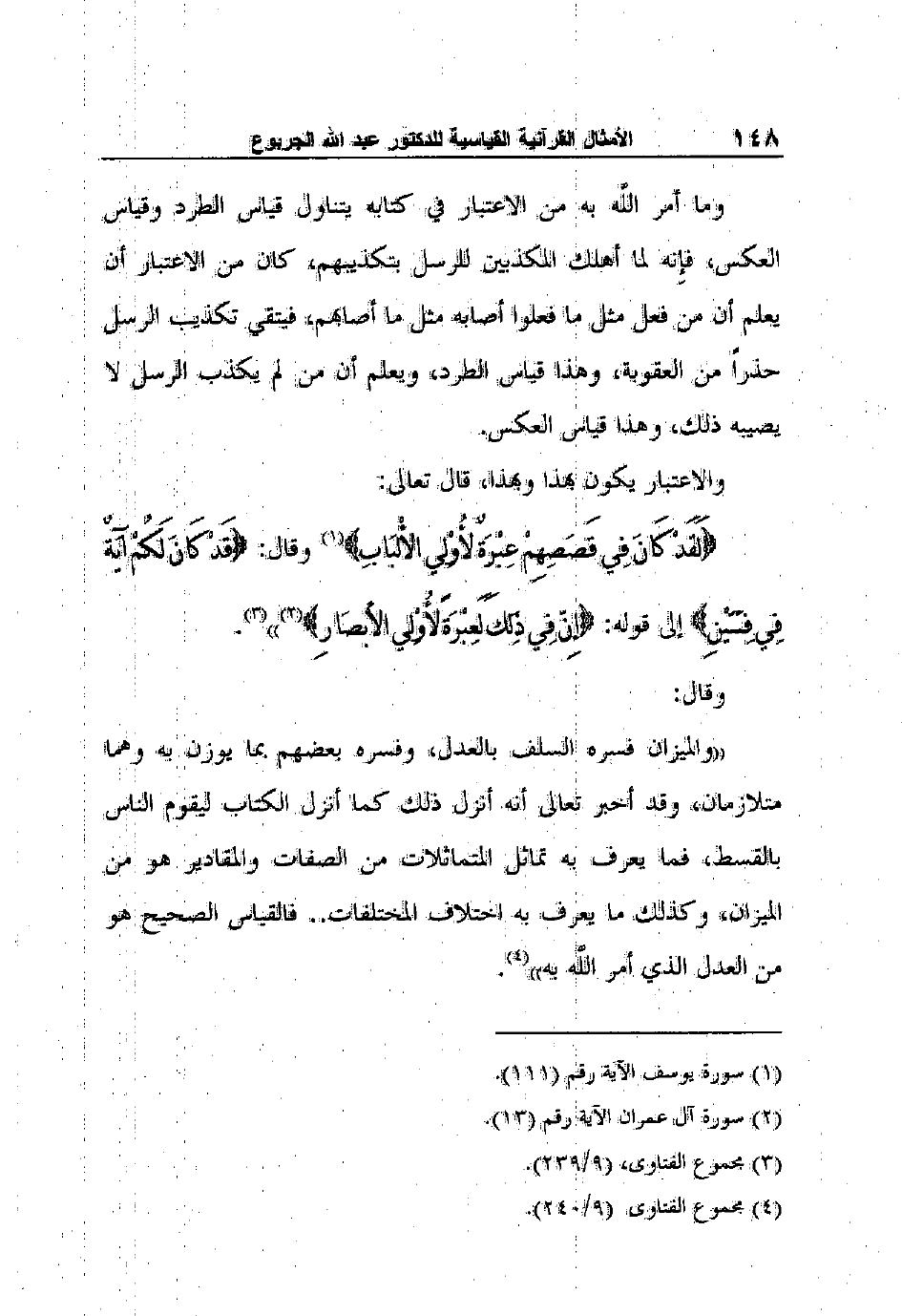 والاعتبار يكون بهذا وبهذا، قال تعالى: {لَقَدْ كَانَ فِي قَصَصِهِمْ عِبْرَةٌ لأُوْلِي الألْبَابِ} 1 وقال: {قَدْ كَانَ لَكُمْ آيَةٌ فِي فِئَتَيْنِ} إلى قوله: {إِنّ فِي ذَلِكَ لَعِبْرَةً لأُوْلِي الأبْصَارِ} 2"3.