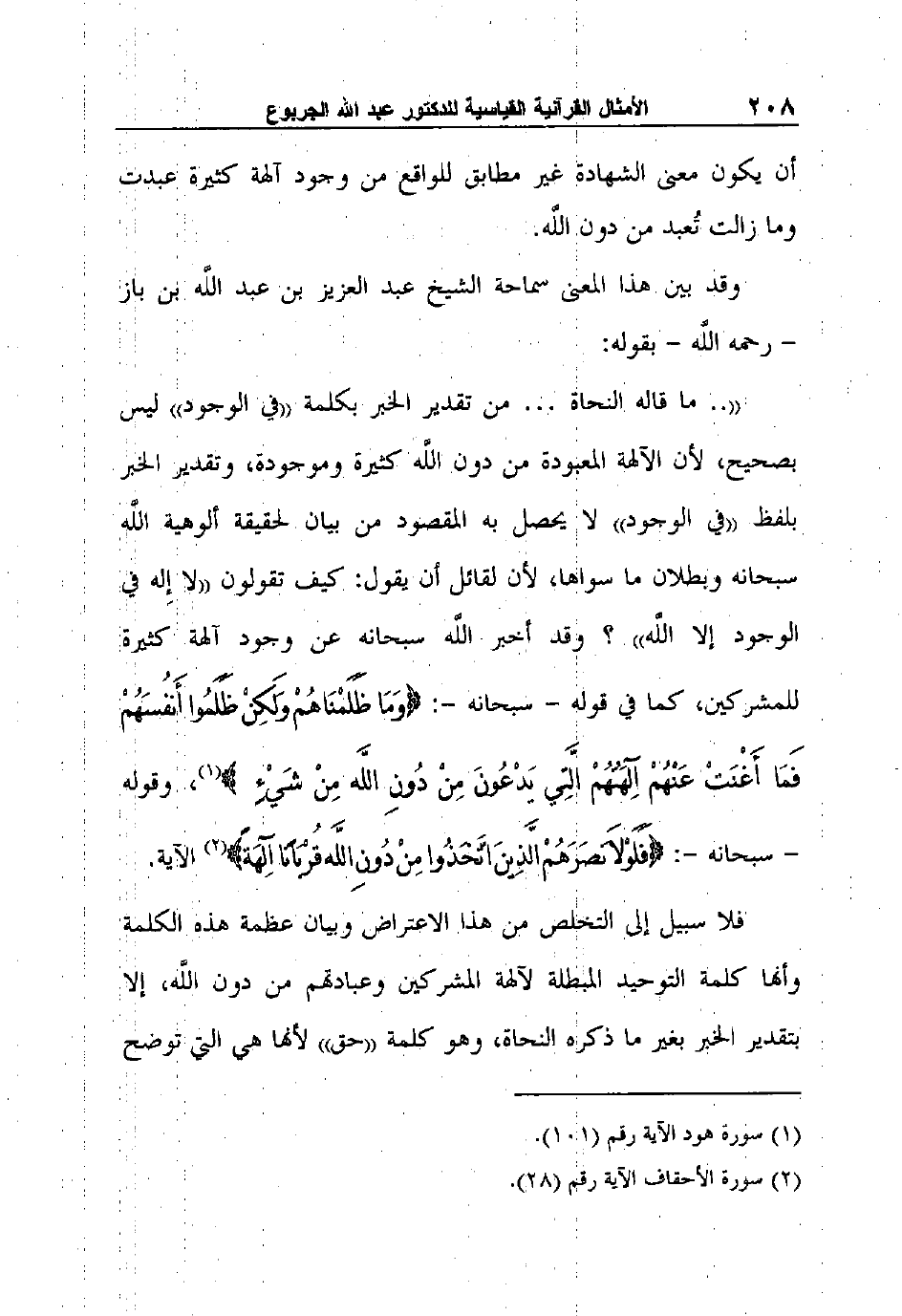 ".. ما قاله النحاة … من تقدير الخبر بكلمة "في الوجود" ليس بصحيح، لأن الآلهة المعبودة من دون اللَّه كثيرة وموجودة، وتقدير الخبر بلفظ "في الوجود" لا يحصل به المقصود من بيان لحقيقة ألوهية اللَّه سبحانه وبطلان ما سواها، لأن لقائل أن يقول: كيف تقولون "لا إِله في الوجود إلا اللَّه"؟ وقد أخبر اللَّه سبحانه عن وجود آلهة كثيرة للمشركين، كما في قوله - سبحانه -: {وَمَا ظَلَمْنَاهُمْ وَلَكِنْ ظَلَمُوا أَنفُسَهُمْ فَمَا أَغْنَتْ عَنْهُمْ آلِهَتُهُمْ الَّتِي يَدْعُونَ مِنْ دُونِ اللَّه مِنْ شَيْءٍ} 1، وقوله - سبحانه -: {فَلَوْلاَ نَصَرَهُمْ الَّذِينَ اتَّخَذُوا مِنْ دُونِ اللَّه قُرْبَانًا آلِهَةً} 2 الآية.