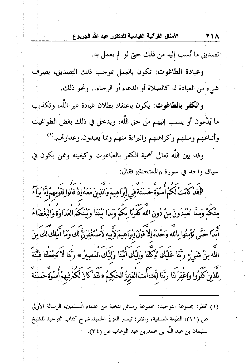 {قَدْ كَانَتْ لَكُمْ أُسْوَةٌ حَسَنَةٌ فِي إِبْرَاهِيمَ وَالَّذِينَ مَعَهُ إِذْ قَالُوا لِقَوْمِهِمْ إِنَّا بُرَآءُ مِنْكُمْ وَمِمَّا تَعْبُدُونَ مِنْ دُونِ اللَّه كَفَرْنَا بِكُمْ وَبَدَا بَيْنَنَا وَبَيْنَكُمُ الْعَدَاوَةُ وَالْبَغْضَاءُ أَبَدًا حَتَّى تُؤْمِنُوا بِاللَّه وَحْدَهُ إِلاَّ قَوْلَ إِبْرَاهِيمَ لأَبِيهِ لأَسْتَغْفِرَنَّ لَكَ وَمَا أَمْلِكُ لَكَ مِنَ اللَّه مِنْ شَيْءٍ رَبَّنَا عَلَيْكَ تَوَكَّلْنَا وَإِلَيْكَ أَنَبْنَا وَإِلَيْكَ الْمَصِيرُ رَبَّنَا لاَ تَجْعَلْنَا فِتْنَةً لِلَّذِينَ كَفَرُوا وَاغْفِرْ لَنَا رَبَّنَا إِنَّكَ أَنْتَ الْعَزِيزُ الْحَكِيمُ لَقَدْ كَانَ لَكُمْ فِيهِمْ أُسْوَةٌ حَسَنَةٌ