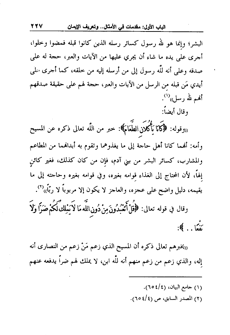 "وقوله: {كَانَا يَأْكُلاَنِ الطَّعَامَ} : خبر من اللَّه تعالى ذكره عن المسيح وأمه: أنهما كانا أهل حاجة إلى ما يغذوهما وتقوم به أبدانهما من المطاعم والمشارب، كسائر البشر من بني آدم، فإِن من كان كذلك، فغير كائنٍ إِلهاً، لأن المحتاج إلى الغذاء قِوامه بغيره، وفي قوامه بغيره وحاجته إلى ما يقيمه، دليل واضح على عجزه، والعاجز لا يكون إلا مربوباً لا ربّاً"2.