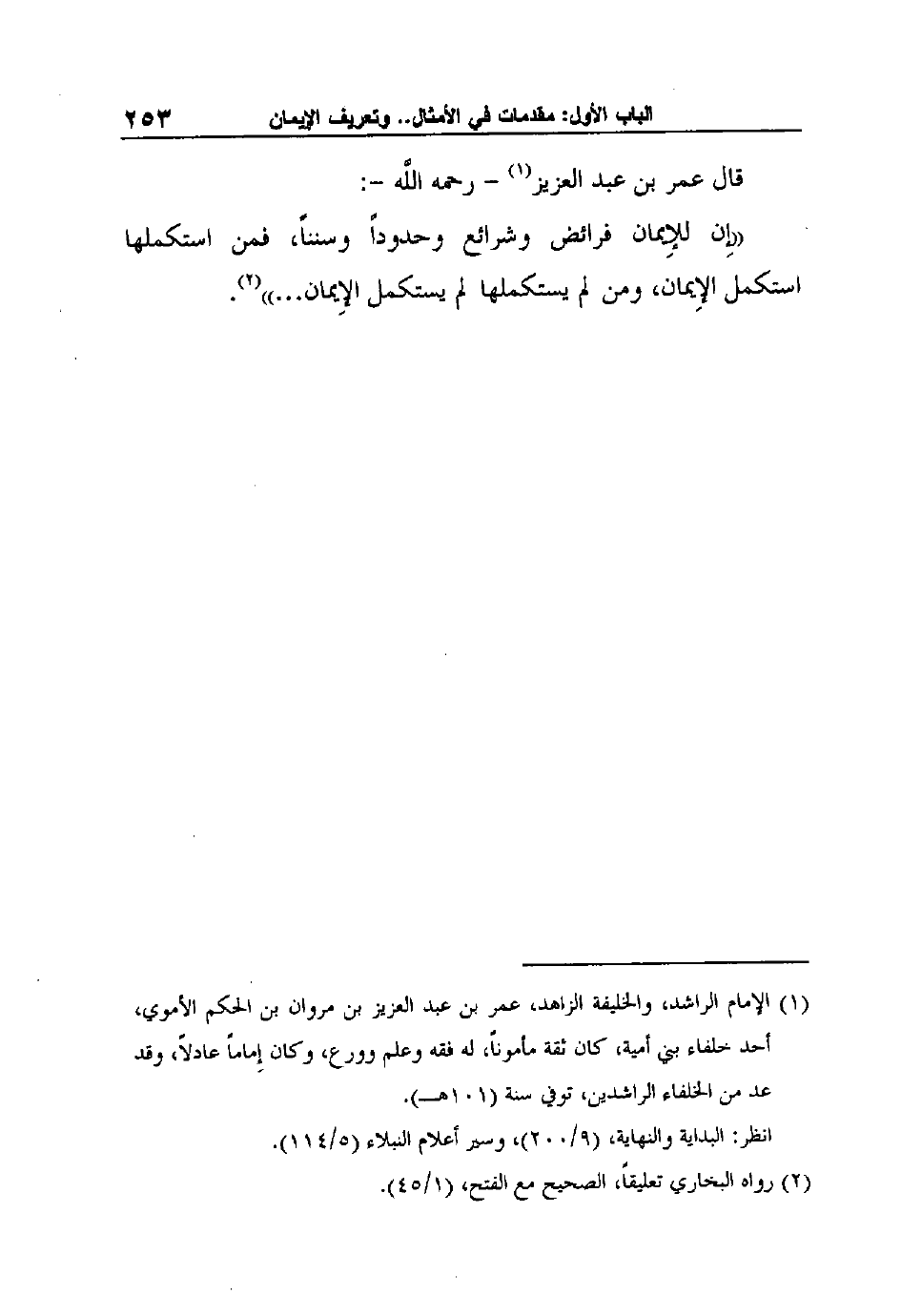 قال عمر بن عبد العزيز1 - رحمه اللَّه -: "إِن للإِيمان فرائض وشرائع وحدوداً وسنناً، فمن استكملها استكمل الإِيمان، ومن لم يستكملها لم يستكمل الإِيمان ... "2.