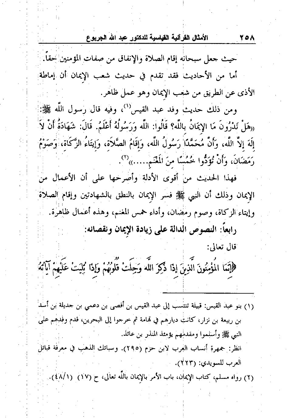 فهذا الحديث من أقوى الأدلة وأصرحها على أن الأعمال من الإِيمان وذلك أن النبي صلى الله عليه وسلم فسر الإِيمان بالنطق بالشهادتين وإقام الصلاة وإيتاء الزكاة، وصوم رمضان، وأداء خمس المغنم، وهذه أعمال ظاهرة.