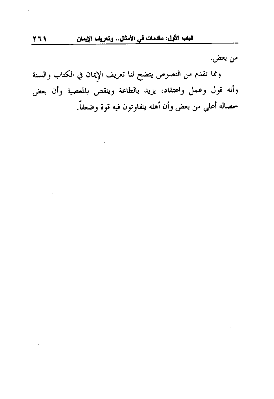 ومما تقدم من النصوص يتضح لنا تعريف الإِيمان في الكتاب والسنة وأنه قول وعمل واعتقاد، يزيد بالطاعة وينقص بالمعصية وأن بعض خصاله أعلى من بعض وأن أهله يتفاوتون فيه قوة وضعفاً.