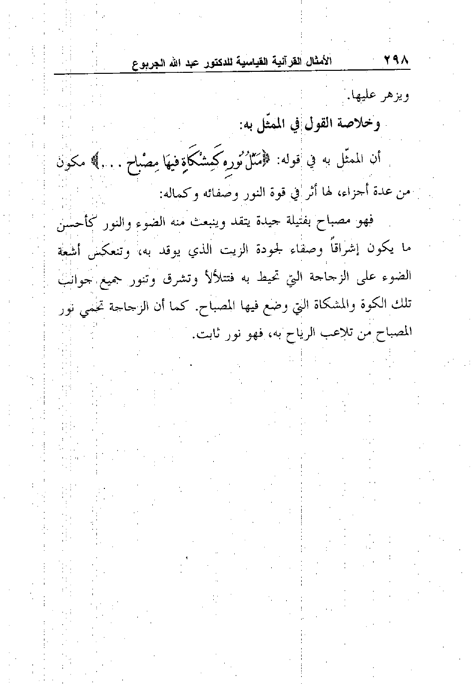 أن الممثّل به في قوله: {مَثَلُ نُورِهِ كَمِشْكَاةٍ فيهَا مِصْباح ... } مكون من عدة أجزاء، لها أثر في قوة النور وصفائه وكماله: