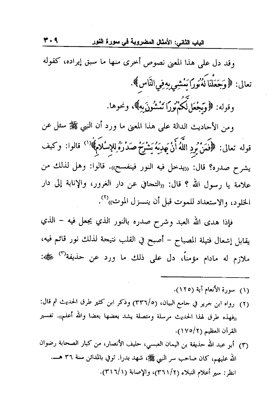 ومن الأحاديث الدالة على هذا المعنى ما ورد أن النبي صلى الله عليه وسلم سئل عن قوله تعالى: {فَمَنْ يُرِدِ اللَّهُ أَنْ يَهدِيَهُ يَشْرَحْ صَدْرَهُ لِلإِسْلاَمِ} 1 قالوا: وكيف يشرح صدره؟ قال: "يدخل فيه النور فينفسح". قالوا: وهل لذلك من علامة يا رسول الله؟ قال: "التجافي عن دار الغرور، والإنابة إلى دار الخلود، والاستعداد للموت قبل أن ينزل الموت"2.