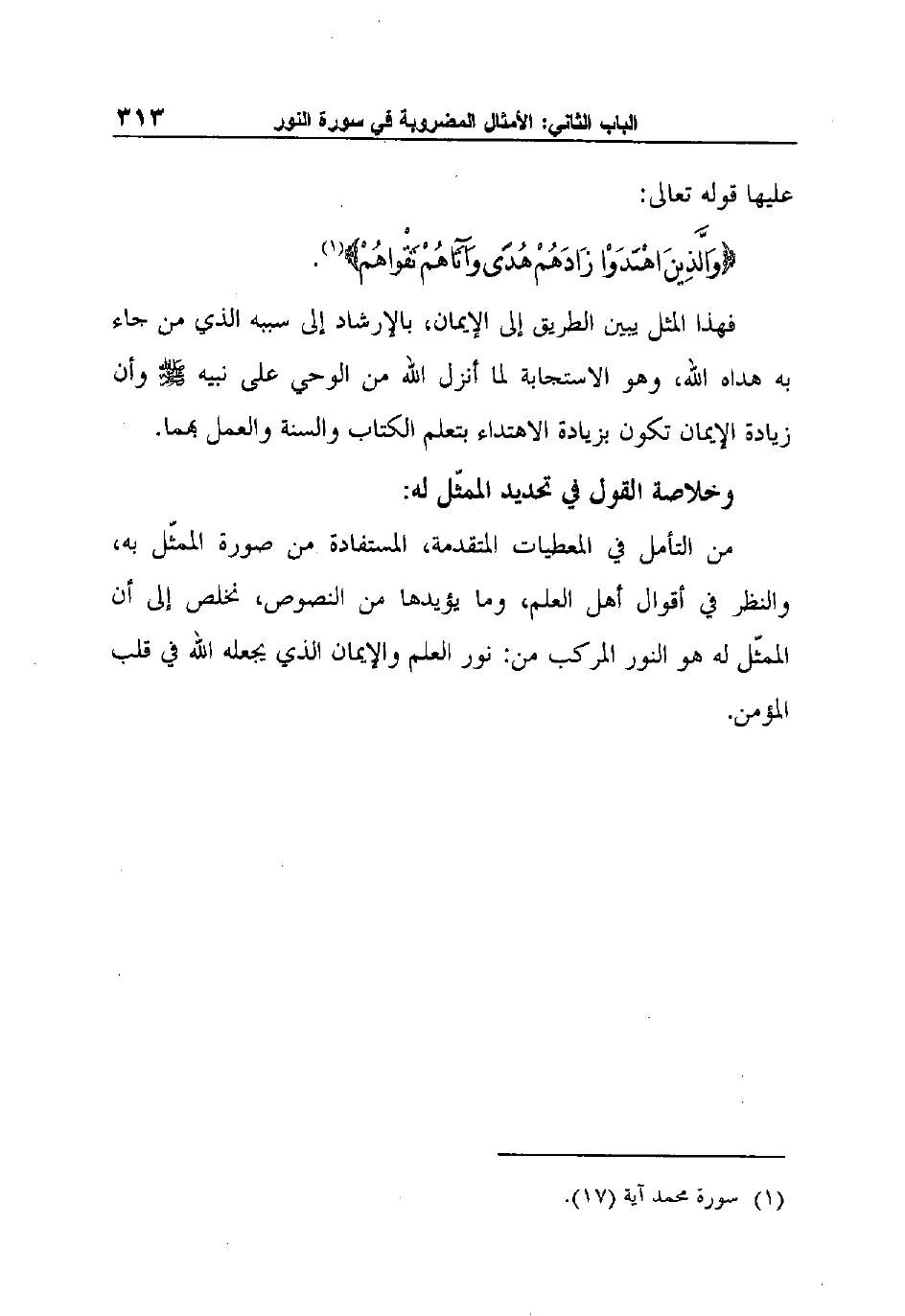 فهذا المثل يبين الطريق إلى الإيمان، بالإرشاد إلى سببه الذي من جاء به هداه الله، وهو الاستجابة لما أنزل الله من الوحي على نبيه صلى الله عليه وسلم وأن زيادة الإيمان تكون بزيادة الاهتداء بتعلم الكتاب والسنة والعمل بهما.
