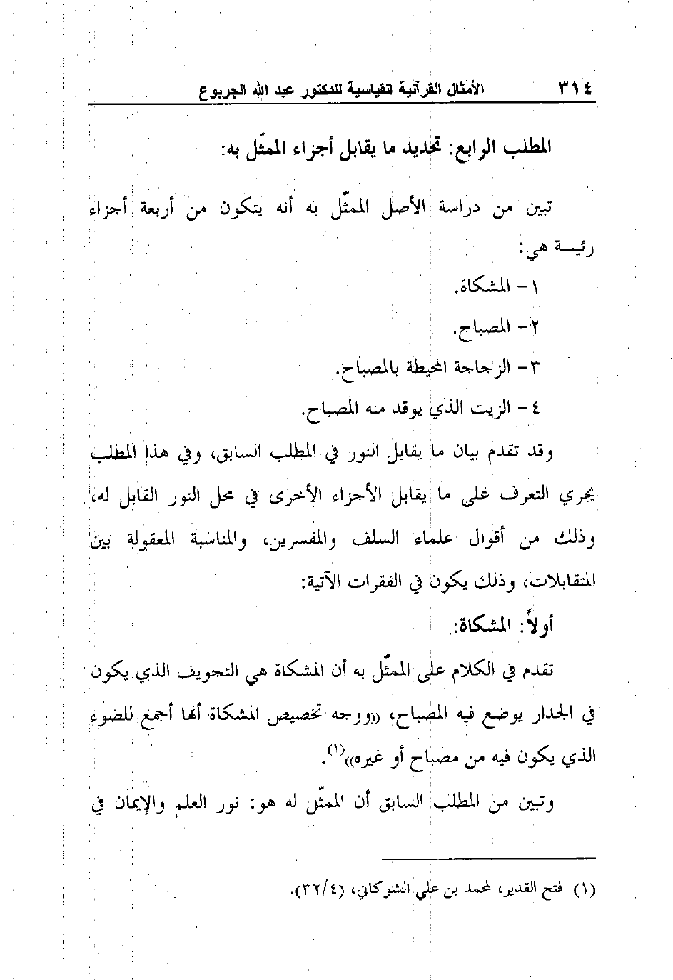 تقدم في الكلام على الممثّل به أن المشكاة هي التجويف الذي يكون في الجدار يوضع فيه المصباح، "ووجه تخصيص المشكاة أنها أجمع للضوء الذي يكون فيه من مصباح أو غيره"1.