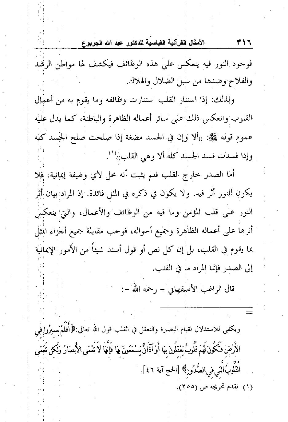 ولذلك: إذا استنار القلب استنارت وظائفه وما يقوم به من أعمال القلوب وانعكس ذلك على سائر أعماله الظاهرة والباطنة، كما يدل عليه عموم قوله صلى الله عليه وسلم: "ألا وإن في الجسد مضغة إذا صلحت صلح الجسد كله وإذا فسدت فسد الجسد كله ألا وهي القلب"1.