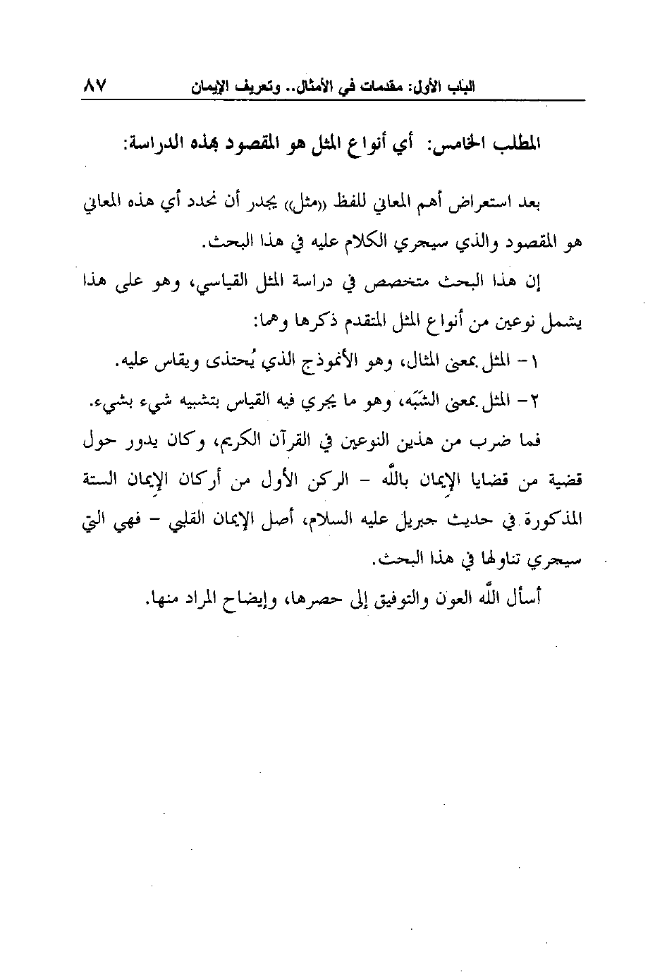 فما ضرب من هذين النوعين في القرآن الكريم، وكان يدور حول قضية من قضايا الإِيمان باللَّه - الركن الأول من أركان الإِيمان الستة المذكورة في حديث جبريل عليه السلام، أصل الإيمان القلبي - فهي التي سيجري تناولها في هذا البحث.