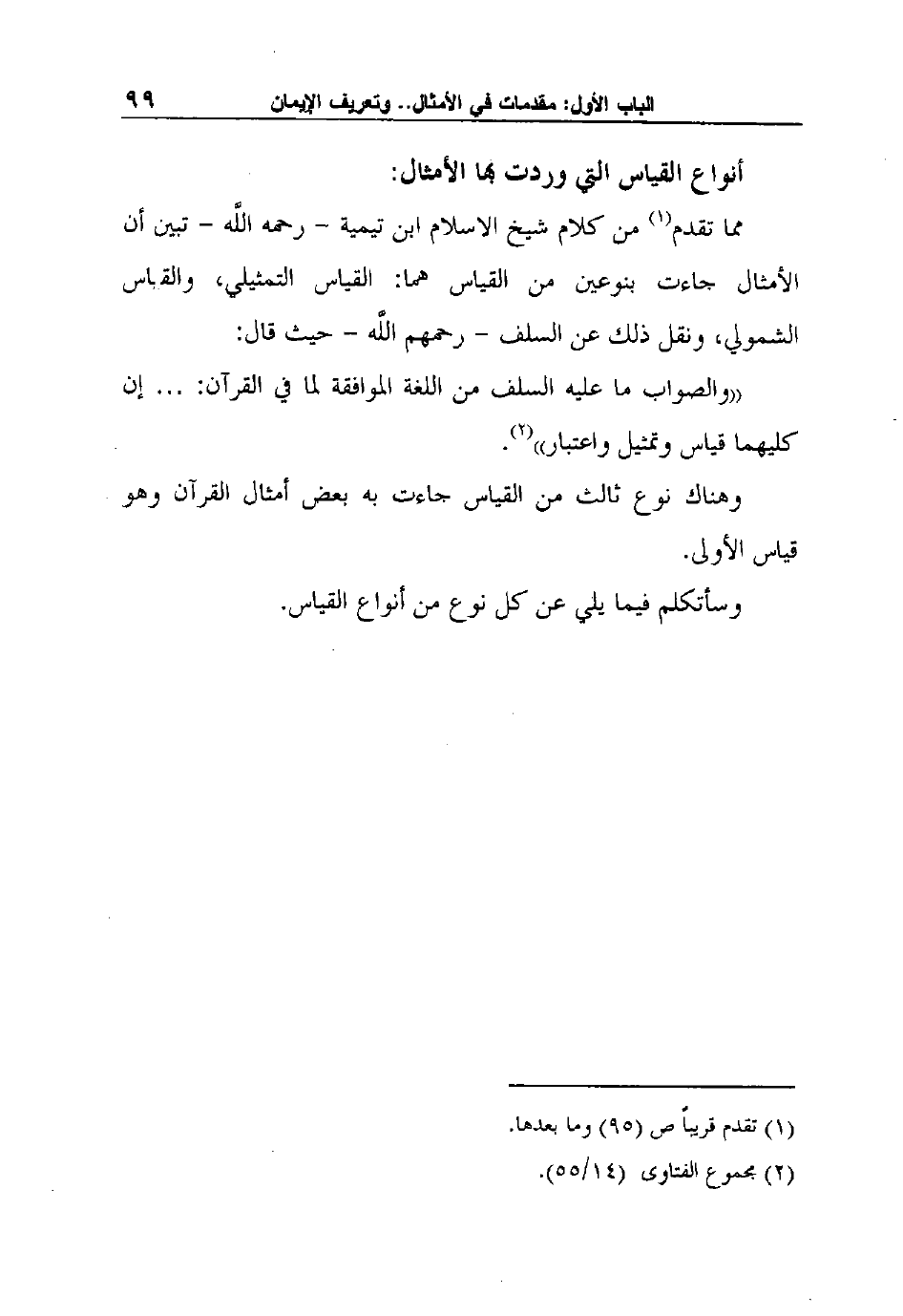 "والصواب ما عليه السلف من اللغة الموافقة لما في القرآن: ... إن كليهما قياس وتمثيل واعتبار"2.