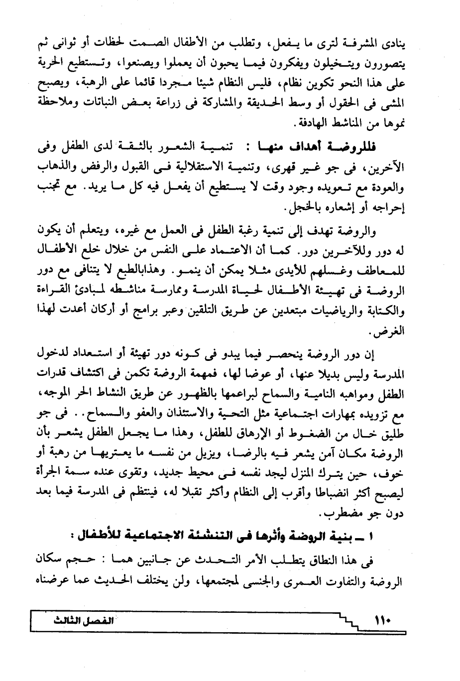 إن دور الروضة ينحصر فيما يبدو في كونه دور تهيئة أو استعداد لدخول المدرسة وليس بديلا عنها، أو عوضا لها، فمهمة الروضة تكمن في اكتشاف قدرات الطفل ومواهبه النامية والسماح لبراعمها بالظهور عن طريق النشاط الحر الموجه، مع تزويده بمهارات اجتماعية مثل التحية والاستئذان والعفو والسماح.. في جو طليق خال من الضغوط أو الإرهاق للطفل، وهذا ما يجعل الطفل يشعر بأن الروضة مكان آمن يشعر فيه بالرضا، ويزيل من نفسه ما يعتريها من رهبة أو خوف، حين يترك المنزل ليجد نفسه في محيط جديد، وتقوى عنده سمة الجرأة ليصبح أكثر انضباطا وأقرب إلى النظام وأكثر تقبلا له، فينتظم في المدرسة فيما بعد دون جو مضطرب.