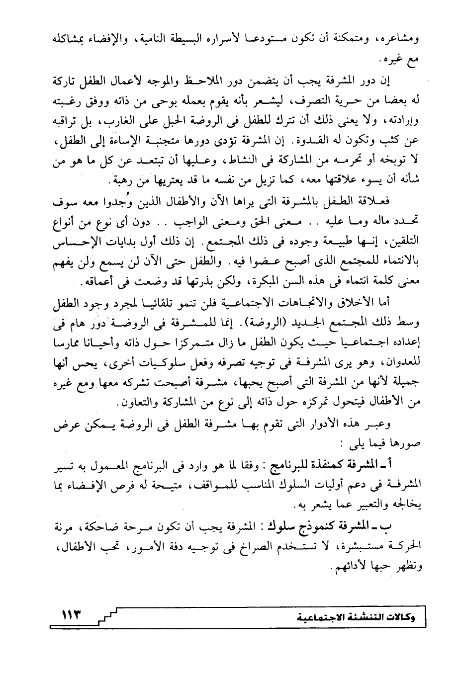أما الأخلاق والاتجاهات الاجتماعية فلن تنمو تلقائيا لمجرد وجود الطفل وسط ذلك المجتمع الجديد "الروضة". إنما للمشرفة في الروضة دور هام في إعداده اجتماعيا حيث يكون الطفل ما زال متمركزا حول ذاته وأحيانا ممارسا للعدوان، وهو يرى المشرفة في توجيه تصرفه وفعل سلوكيات أخرى، يحس أنها جميلة لأنها من المشرفة التي أصبح يحبها، مشرفة أصبحت تشركه معها ومع غيره من الأطفال فيتحل تمركزه حول ذاته إلى نوع من المشاركة والتعاون.