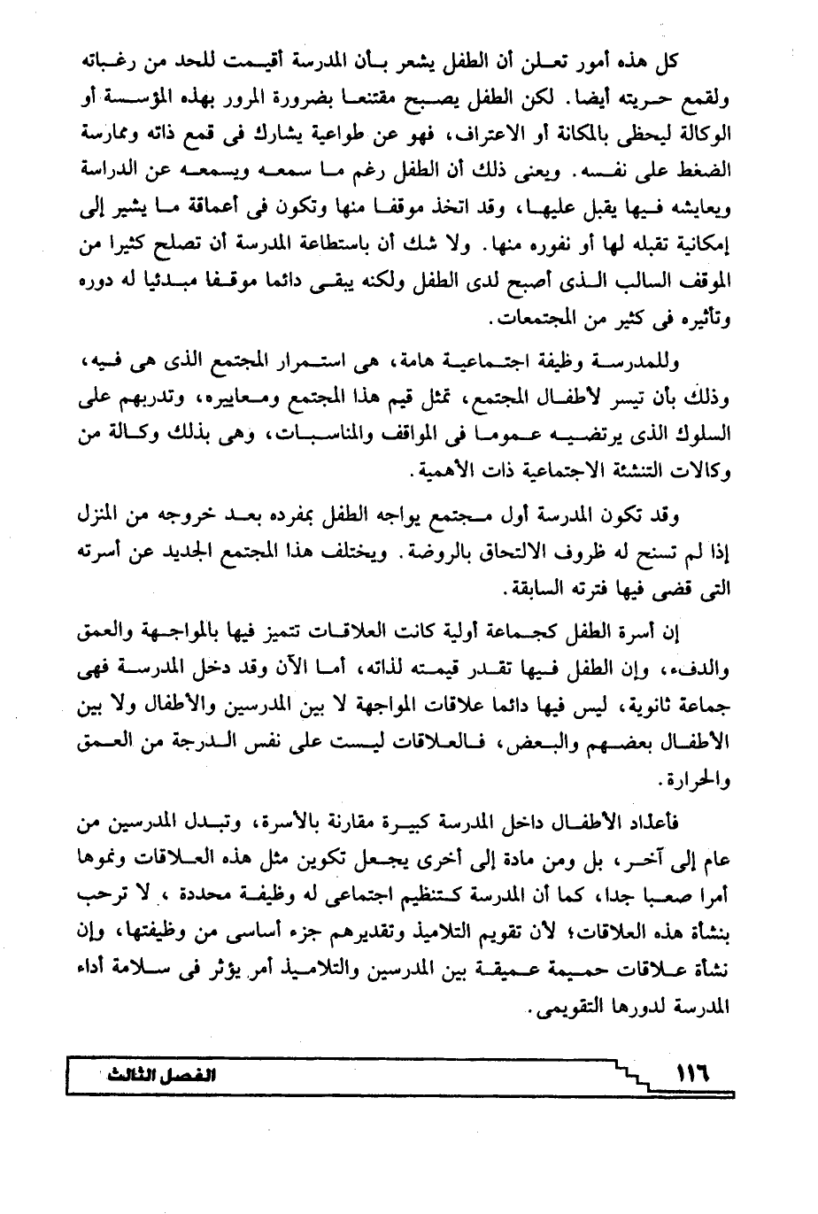 فأعداد الأطفال داخل المدرسة كبيرة مقارنة بالأسرة، وتبدل المدرسين من عام إلى آخر، بل ومن مادة إلى أخرى يجعل تكوين مثل هذه العلاقات ونموها أمرا صعبا جدا، كما أن المدرسة كتنظيم اجتماعي له وظيفة محددة، لا ترحب بنشأة هذه العلاقات، لأن تقويم التلاميذ وتقديرهم جزء أساسي من وظيفتها، وإن نشأة علاقات حميمة عميقة بين المدرسين والتلاميذ أمر يؤثر في سلامة أداء المدرسة لدورها التقويمي.