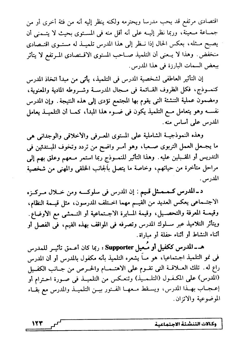 هـ- المدرس ككفيل أو معيل Supporter: ربما كان أعمق تأثير للمدرس في نمو التلميذ اجتماعيا، هو ما يشعره التلميذ بأنه مكفول بالمدرس أو أن المدرس راع له. تلك العلاقة التي تقوم على الاهتمام والحرص من جانب الكفيل "المدرس" على المكفول "التلميذ" وتنعكس من التلميذ في صورة احترام أو إعجاب بهذا المدرس، ويسقط معها الفتور بين التلميذ والمدرس مع بقاء الموضوعية والاتزان.