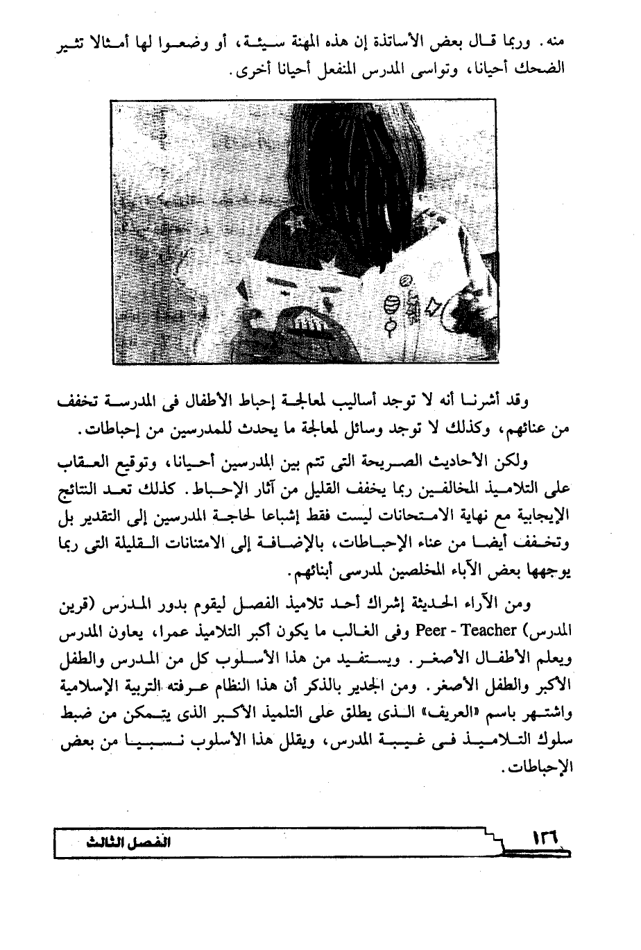 ومن الآراء الحديثة إشراك أحد تلاميذ الفصل ليقوم بدور المدرس "قرين المدرس" Peer- Teacher وفي الغالب ما يكون أكبر التلاميذ عمرا، يعاون المدرس ويعلم الأطفال الأصغر. ويستفيد من هذا الأسلوب كل من المدرس والطفل الأكبر والطفل الأصغر. ومن الجدير بالذكر أن هذا النظام عرفته التربية الإسلامية واشتهر باسم "العريف" الذي يطلق على التلميذ الأكبر الذي يتمكن من ضبط سلوك التلاميذ في غيبة المدرس، ويقلل هذا الأسلوب نسبيا من بعض الإحباطات.