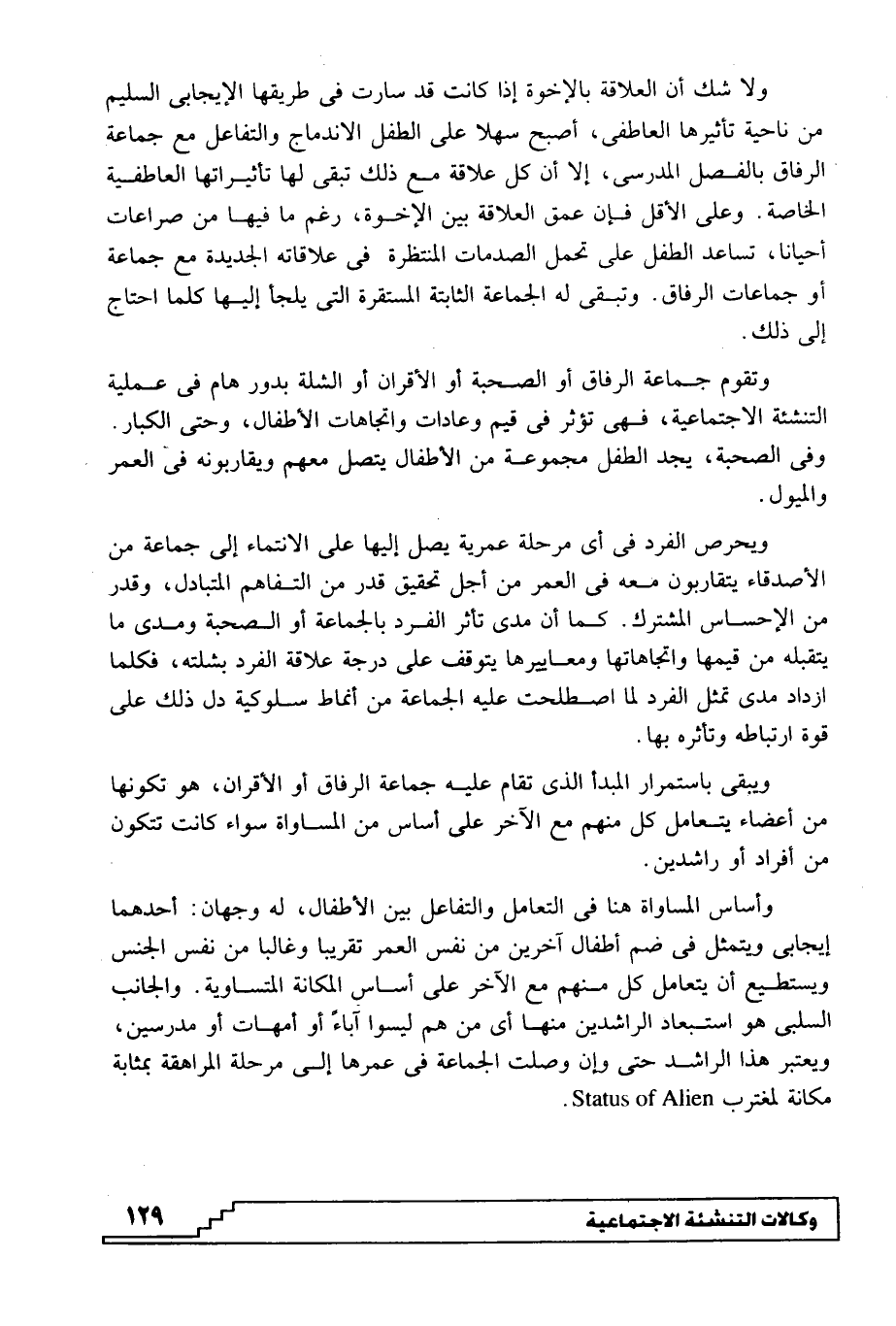وأساس المساواة هنا في التعامل والتفاعل بين الأطفال، له وجهان: أحدهما إيجابي ويتمثل في ضم أطفال آخرين من نفس العمر تقريبا وغالبا من نفس الجنس ويستطيع أن يتعامل كل منهم مع الآخر على أساس المكانة المتساوية. والجانب السلبي هو استبعاد الراشدين منها أي من هم ليسوا آباء أو أمهات أو مدرسين، ويعتبر هذا الراشد حتى وإن وصلت الجماعة في عمرها إلى مرحلة المراهقة بمثابة مكانة لمغترب Status of Alien.