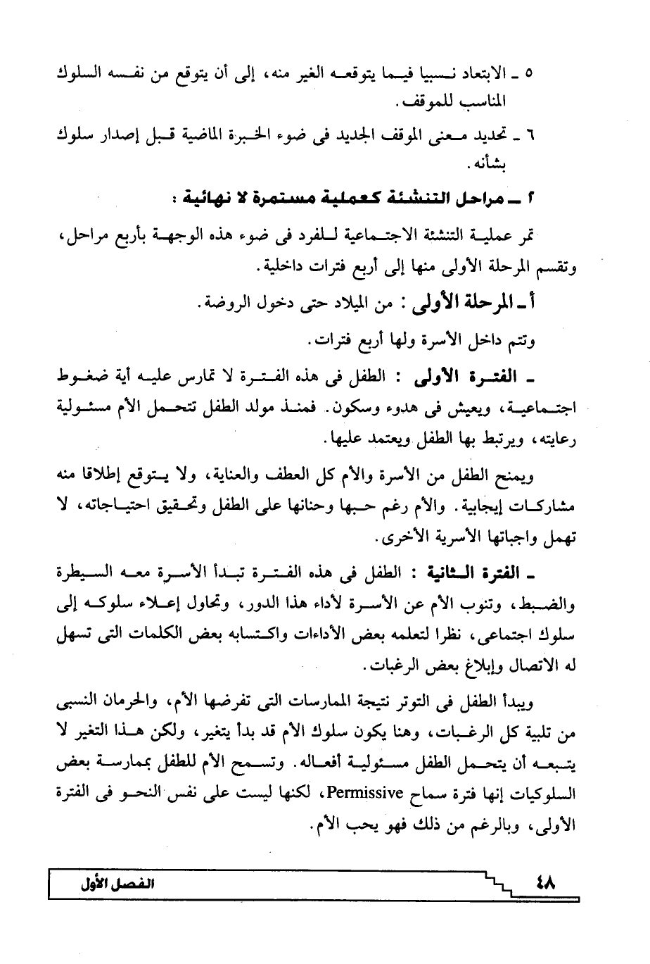 الفترة الثانية: الطفل في هذه الفترة تبدأ الأسرة معه السيطرة والضبط، وتنوب الأم عن الأسرة لأداء هذا الدور، وتحاول إعلاء سلوكه إلى سلوك اجتماعي، نظرا لتعلمه بعض الأداءات واكتسابه بعض الكلمات التي تسهل له الاتصال وإبلاغ بعض الرغبات.