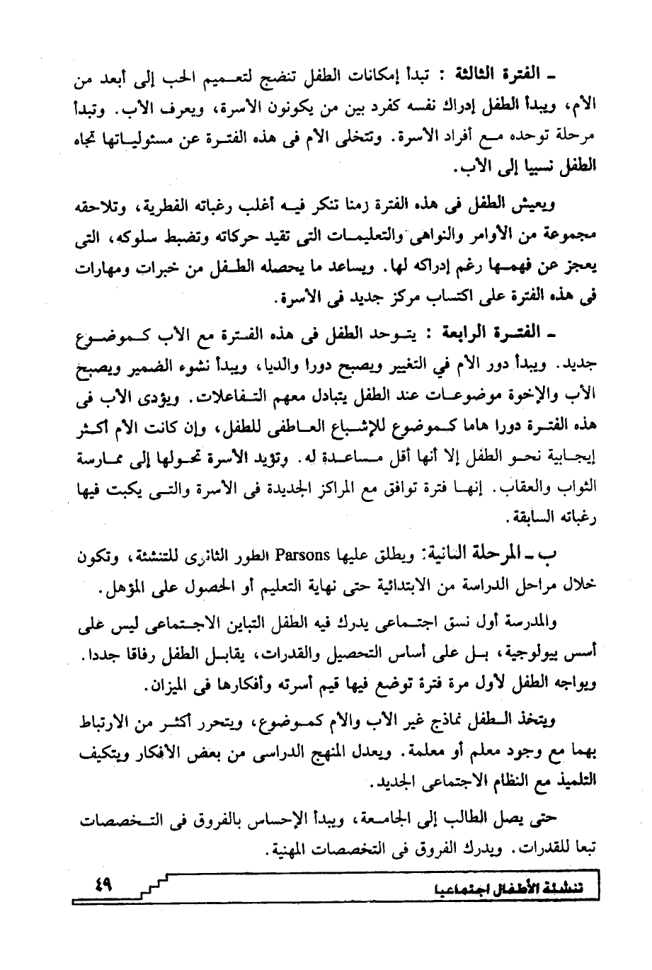ب- المرحلة الثانية: ويطلق عليها Parsons الطور الثانوي للتنشئة، وتكون خلال مراحل الدراسة من الابتدائية حتى نهاية التعليم أو الحصول على المؤهل.