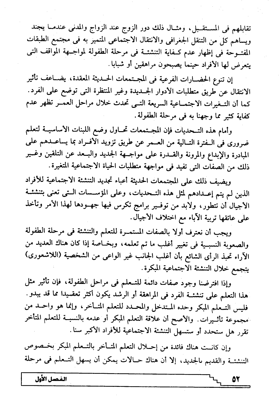 وإذا افترضنا وجود صفات دائمة للتعلم في مراحل الطفولة، فإن تأثير مثل هذا التعلم على تنشئة الفرد في المراهقة أو الرشد يكون أكثر تعقيدا مما قد يبدو فليس التعلم المبكر وحده المتدخل والمحدد للتعلم المتأخر، وإنما هو واحد من مجموعة تأثيرات. والأصح أن علاقة التعلم المبكر أو عدمه بالنسبة للتعلم المتأخر تقرر هل ستحدد أو ستسهل التنشئة الاجتماعية للأفراد الأكبر سنا.