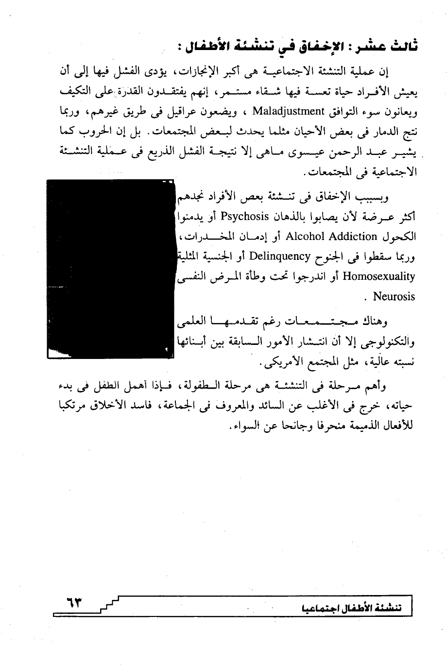 وبسبب الإخفاق في تنشئة بعض الأفراد نجدهم أكثر عرضة لأن يصابون بالذهان Psychosis أو يدمنوا الكحول Alcohol Addiction أو إدمان المخدرات، وربما سقطوا في الجنوح Delinquency أو الجنسية المثلية Homosexuality أو اندرجوا تحت وطأة المرض النفسي Neurosis.