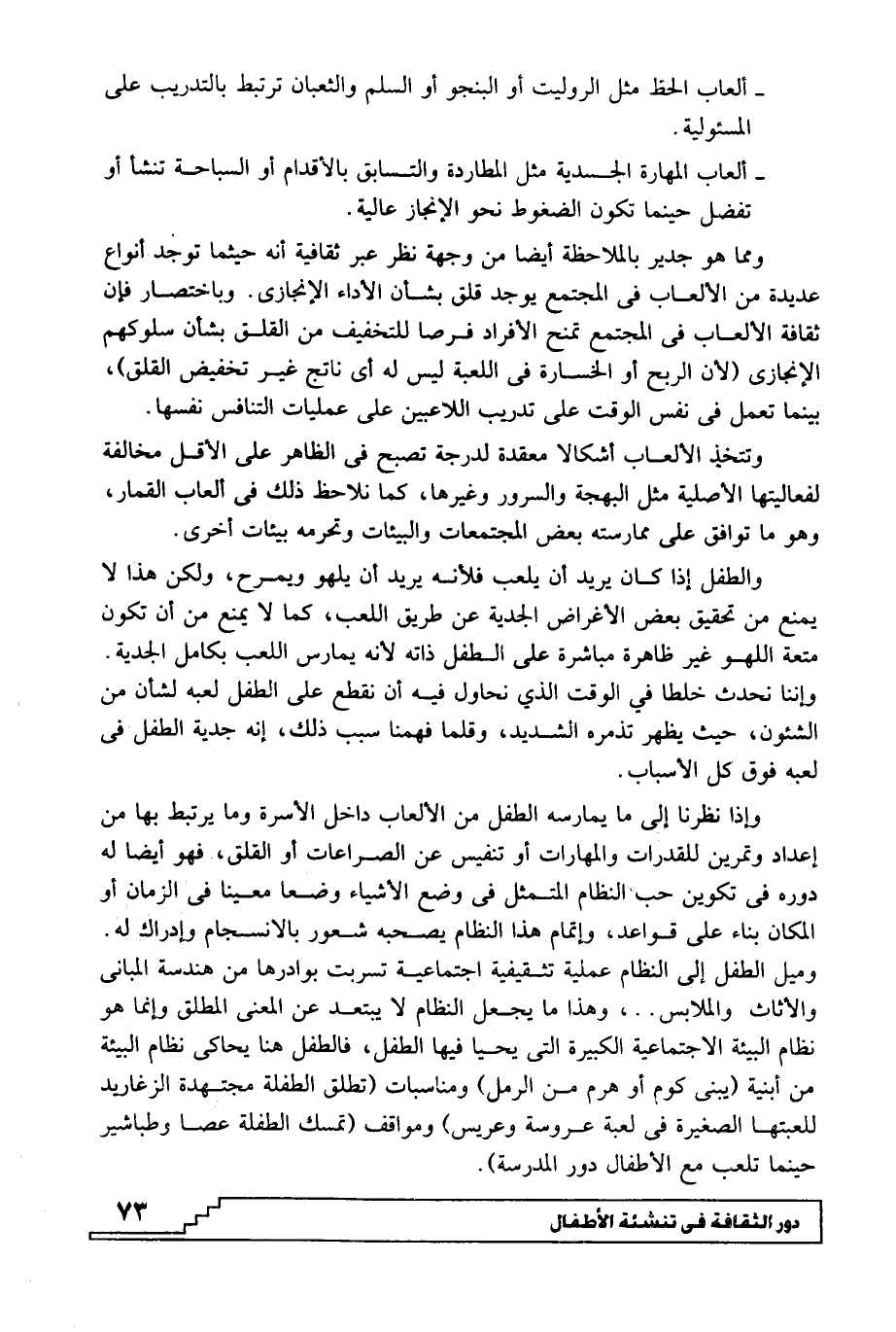 والطفل إذا كان يريد أن يلعب فلأنه يريد أن يلهو ويمرح، ولكن هذا لا يمنع من تحقيق بعض الأغراض الجدية عن طريق اللعب، كما لا يمنع من أن تكون متعة اللهو غير ظاهرة مباشرة على الطفل ذاته لأنه يمارس اللعب بكامل الجدية. وإننا نحدث خلطا في الوقت الذي نحاول فيه أن نقطع على الطفل لعبة لشأن من الشئون، حيث يظهر تذمره الشديد، وقلما فهمنا سبب ذلك، إنه جدية الطفل في لعبة فوق كل الأسباب.