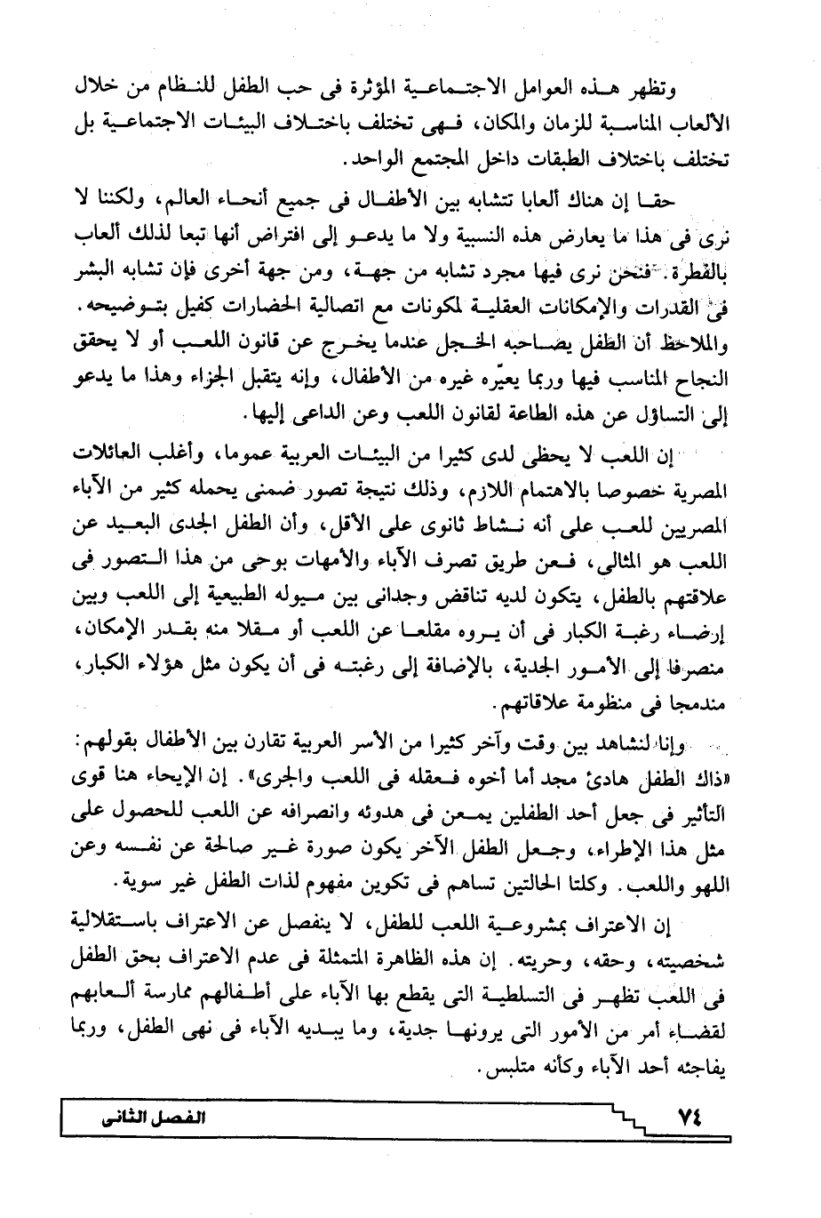 إن اللعب لا يحظى لدى كثيرا من البيئات العربية عموما، وأغلب العائلات المصرية خصوصا بالاهتمام اللازم وذلك نتيجة تصور ضمني يحمله كثير من الآباء المصريين للعب على أنه نشاط ثانوي على الأقل، وأن الطفل الجدي البعيد عن اللعب هو المثالي، فعن طريق تصرف الآباء والأمهات بوحي من هذا التصور في علاقتهم بالطفل، يتكون لديه تناقض وجداني بين ميوله الطبيعية إلى اللعب وبين إرضاء رغبة الكبار في أن يروه مقلعا عن اللعب أو مقلا منه بقدر الإمكان، منصرفا إلى الأمور الجدية، بالإضافة إلى رغبته في أن يكون مثل هؤلاء الكبار، مندمجا في منظومة علاقاتهم.