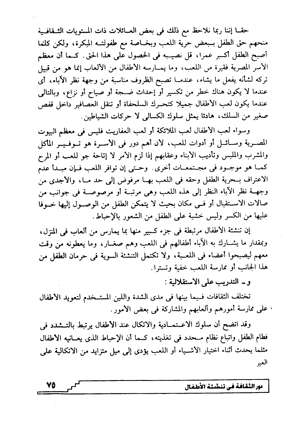 حقا إننا ربما نلاحظ مع ذلك في بعض العائلات ذات المستويات الثقافية منحهم حق الطفل ببعض حرية اللعب وبخاصة مع طفولته المبكرة، ولكن كلما أصبح الطفل أكبر عمرا، قل نصيبه في الحصول على هذا الحق. كما أن معظم الأسر المصرية فقيرة من اللعب، وما يمارسه الأطفال من الألعاب إنما هو من قبيل تركه لشأنه يفعل ما يشاء، عندما تصبح الظروف مناسبة من وجهة نظر الآباء، أي عنندما لا يكون هناك خطر من تكسير أو إحداث ضجة أو صياح أو نزاع، وبالتالي عندما يكون لعب الأطفال جميلا كتحرك السلحفاة أو تنقل العصافير داخل قفص صغير من السلك هادئا يمثل سلوك الكسالى لا حركات الشياطين.