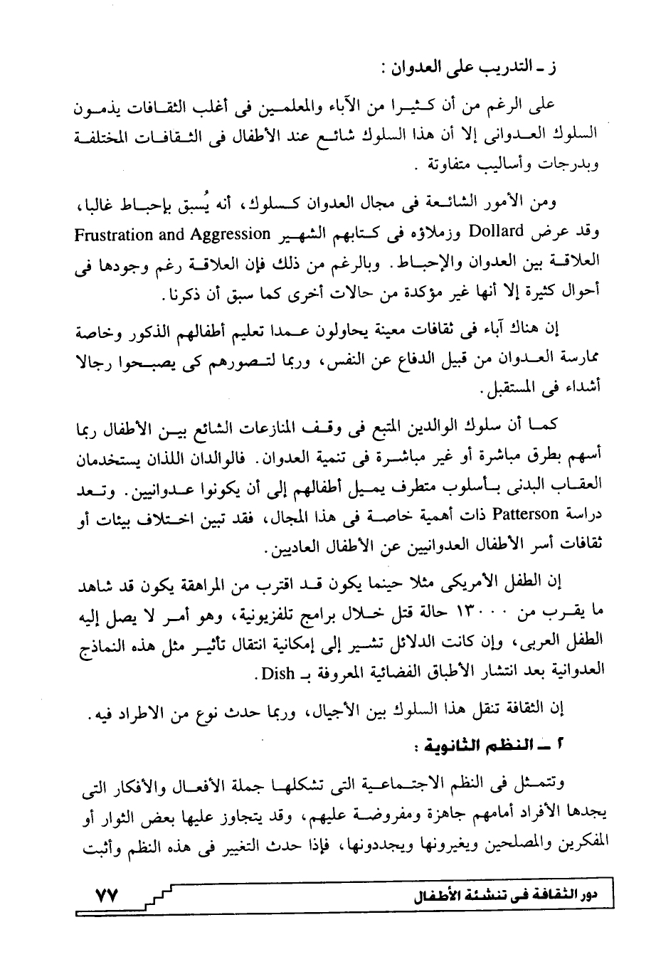 كما أن سلوك الوالدين المتبع في وقف المنازعات الشائع بين الأطفال ربما أسهم بطرق مباشرة أو غير مباشرة في تنمية العدوان. فالوالدان اللذان يستخدمان العقاب البدني بأسلوب متطرف يميل أطفالهم إلى أن يكونوا عدوانيين. وتعد دراسة Patterson ذات أهمية خاصة في هذا المجال، فقد تبين اختلاف بيئات أو ثقافات أسر الأطفال العدوانيين عن الأطفال العاديين.