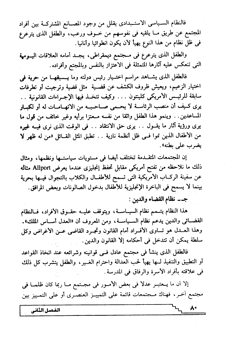 فالطفل الذي يشاهد مراسم اختيار رئيس دولته وما يسبقها من حرية في اختيار الزعيم، ويعيش ظروف الكشف عن قضية مثل قضية وترجيت أو تطرفات سابقة للرئيس الأمريكي كلينتون ... وكيف تتخذ فيها الإجراءات القانونية ... يرى كيف أن منصب الرئاسة لا يحمي صاحبه من الاتهامات له أو لكبار المساعدين ... وينمو هذا الطفل واثقا من نفسه معتزا برأيه وغير خائف من قول ما يرى ورؤية آثار ما يقول ... يرى حق الانتقاد ... في الوقت الذي نرى فيه غيره من الأطفال الذين نموا في ظل أنظمة نازية ... تطبق المثل القاتل "من له ظهر لا يضرب على بطنه".