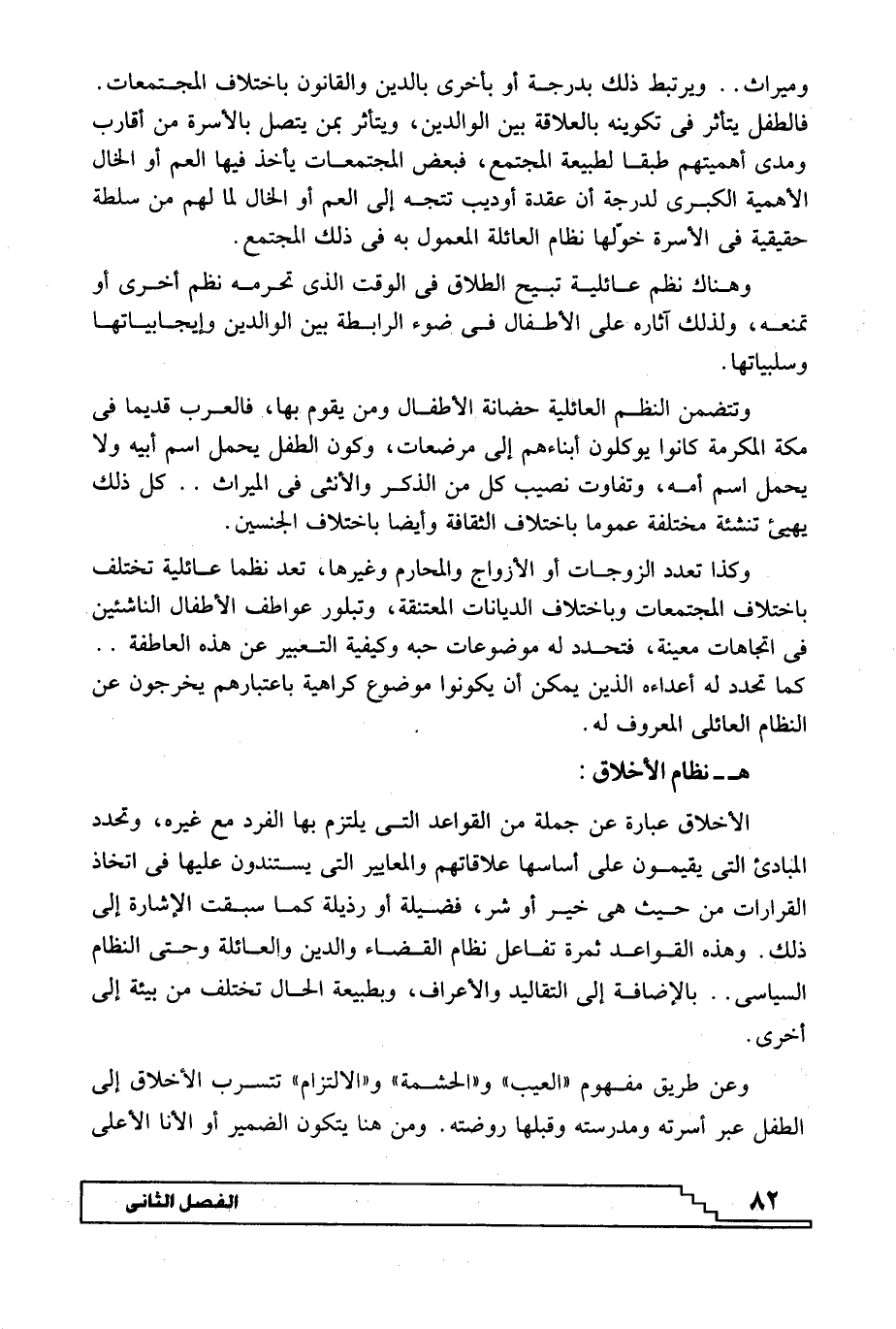 وميراث ... ويرتبط ذلك بدرجة أو بأخرى بالدين والقانون باختلاف المجتمعات. فالطفل يتأثر في تكوينه بالعلاقة بين الوالدين، ويتأثر بمن يتصل بالأسرة من أقارب ومدى أهميتهم طبقا لطبيعة المجتمع، فبعض المجتمعات يأخذ فيها العم أو الخال الأهمية الكبرى لدرجة أن عقدة أوديب تتجه إلى العم أو الخال لما لهم من سلطة حقيقية في الأسرة خولها نظام العائلة المعمول به في ذلك المجتمع.