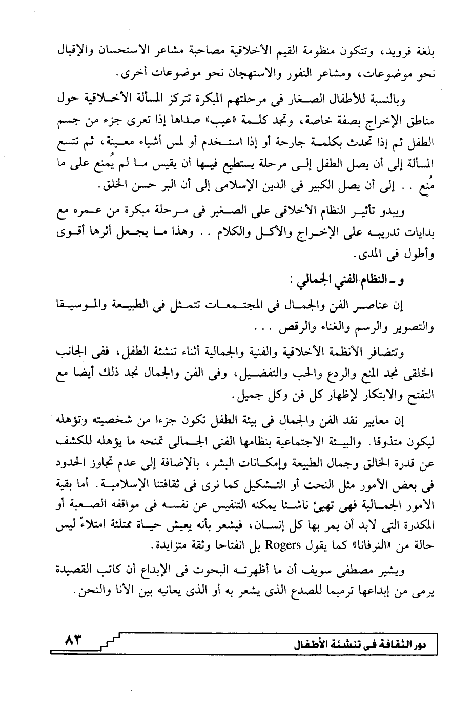 وتتضافر الأنظمة الأخلاقية والفنية والجمالية أثناء تنشئة الطفل، ففي الجانب الخلقي نجد المنع والردع والحب والتفصيل، وفي الفن والجمال نجد ذلك أيضا مع التفتح والابتكار لإظهار كل فن وكل جميل.